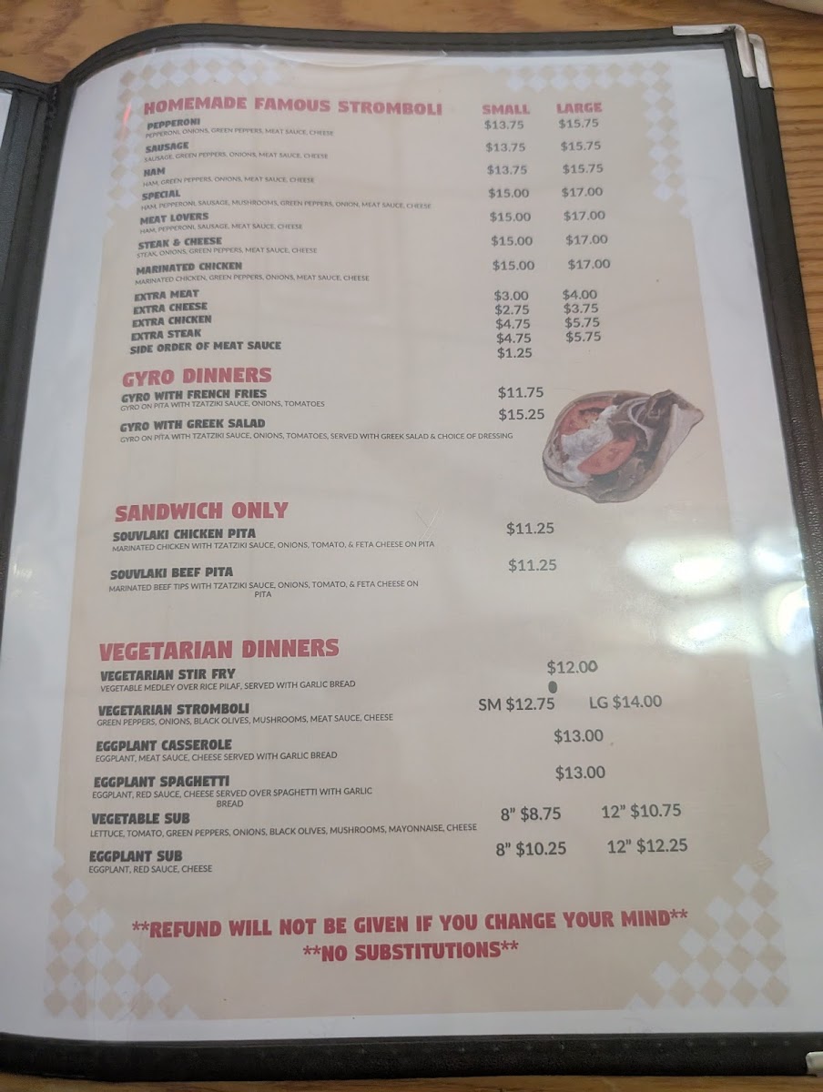In addition to pizza and subs, the menu includes homemade Greek specialties like Greek Lasagna, Greek Pasta (with options to add chicken or shrimp), Spanakopita, and Souvlaki dinners served with chicken or beef. Pasta dishes beyond the Greek selections include Manny Style Spaghetti, Chicken Fettuccine Alfredo, Shrimp Alfredo, and Veal Parmigiana.